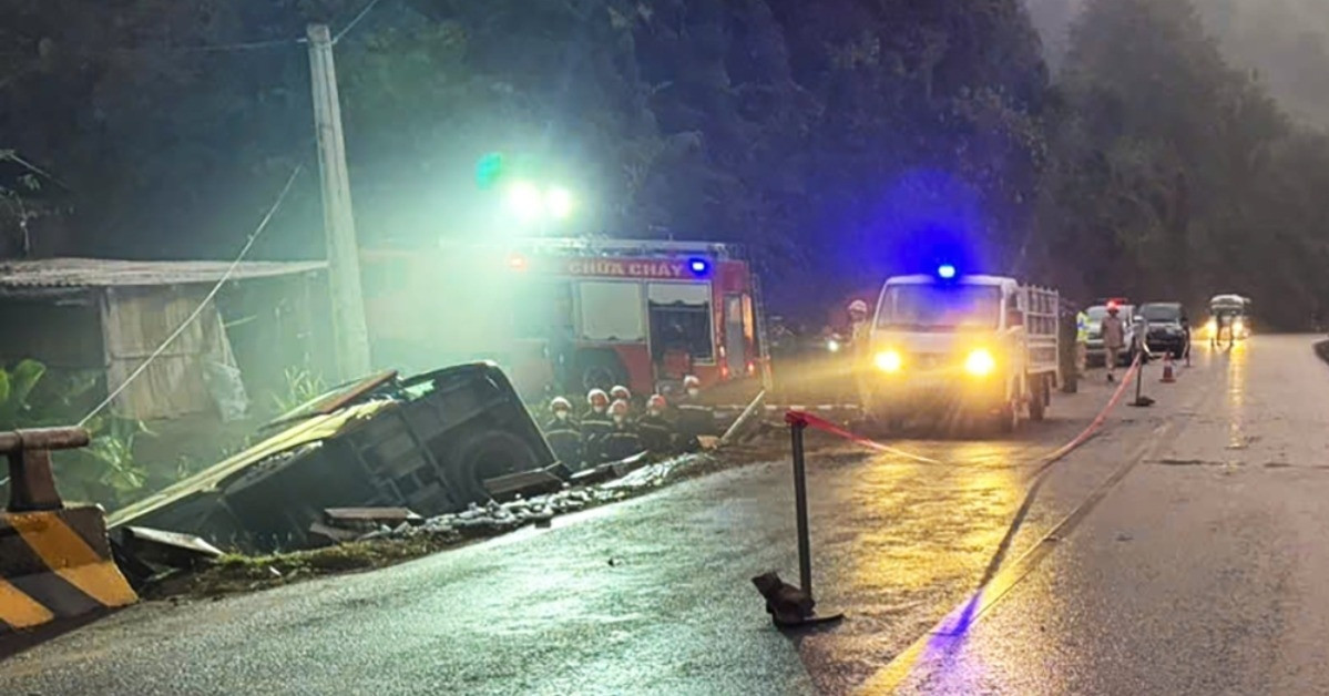 Khi tới Km 225+150 thuộc bản Lắc Kén, xã Chiềng Hặc, tỉnh Sơn La, chiếc xe tự lao xuống cống thoát nước bên phải đường, lật ngang. Thời điểm xảy ra tai nạn trên xe có khoảng 18 người (14 hành khách, 2 lái xe, 2 phụ xe).