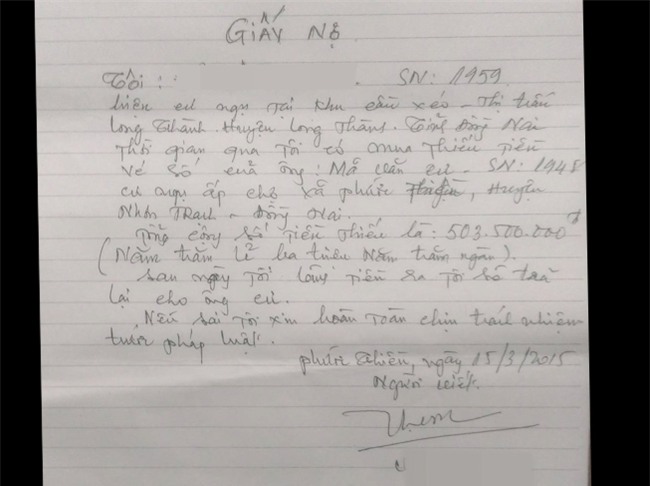 Liên tục từ năm 2009 đến 2015, ông T. đã mua nợ tiền vé số của ông Cự với tổng số tiền 503.500.000 đồng. Không có tiền trả, ông T. đã viết giấy tay đưa cho ông Cự.