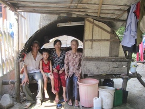 Chị Phước - vợ anh Vui giàn giụa nước mắt: “Khổ quá mấy anh ơi! Hơn 4 năm không có điện và nước, nơi đi vệ sinh cũng không có luôn. Hàng ngày tui phải lặn lội cách đây 500m để đi sang nhà ngoại mang từng thùng nước về cho gia đình sinh hoạt”.