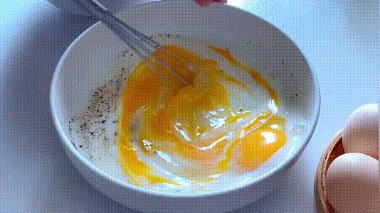 Đập trứng vào bát, thêm sữa tươi, bột tiêu vào.