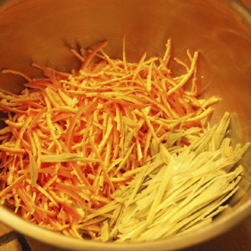 Bước 1: Bạn rửa sạch gừng sau đó thái sợi. Quýt bóc vỏ, rửa sạch sau đó thái sợi tương tự gừng.