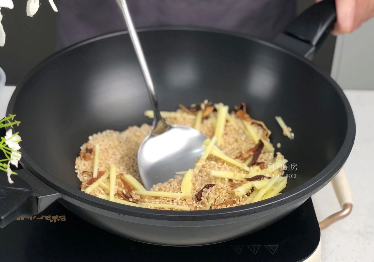 Bước 2: Gạo đem vo sạch, sau đó cho vào chảo cùng với vỏ quýt và gừng thái sợi rồi đảo trên mức lửa nhỏ nhất. Bạn cần phải đảo liên tục, đều tay để đảm bảo các nguyên liệu khô và chín vàng đều. Khi bạn càng đảo thì màu sắc của gạo lứt ngày càng vàng hơn. Đảo cho đến khi gừng khô nước, vỏ quýt khô có thể dễ dàng bẻ đôi được thì tắt bếp, để nguội. Sau đó bạn cho vào hũ thủy tinh đậy kín và có thể bảo quản trong tủ lạnh để dùng dần trong cả mùa đông.