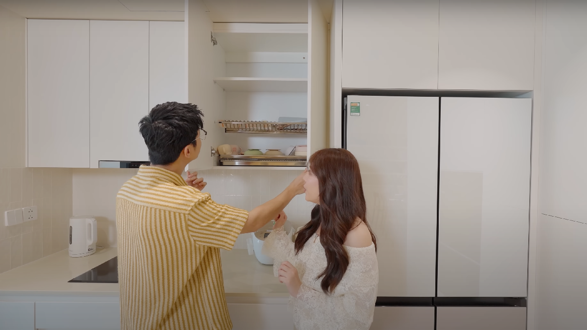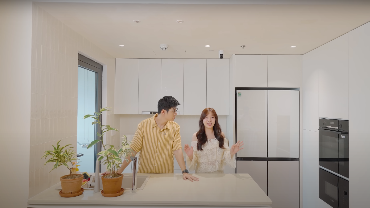 Căn bếp được cặp đôi gọi là "trái tim của ngôi nhà". Cả hai quyết định đập bỏ một bức tường treo TV, để tạo khu vực bếp mở, kết nối các không gian với nhau.