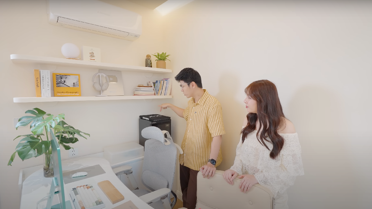 Ở khu vực sảnh vào, cặp đôi bố trí tủ giày kiểu kịch trần, thêm ngăn đựng những vật dụng nhỏ như chìa khóa, pin, tua vít, khẩu trang, băng dính. Theo cả hai, một trong những quyết định đúng đắn nhất là tối ưu hệ tủ trong nhà, vừa tạo tính thẩm mỹ, vừa tạo hiệu năng.