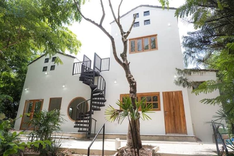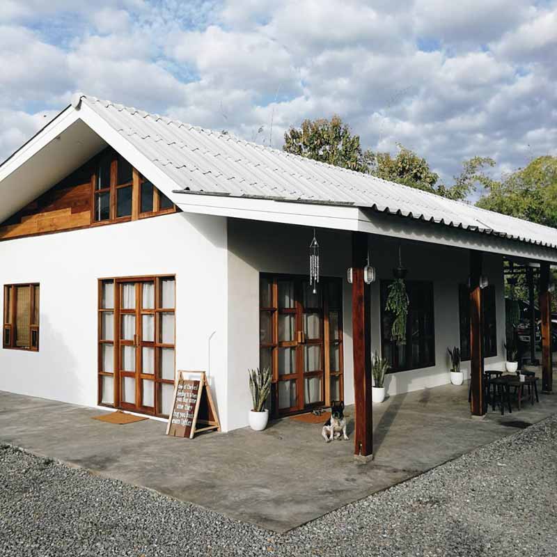 Ai thích vào một quán cà phê được bao quanh bởi những khu vườn xanh tươi? Hãy thử xây dựng một ngôi nhà theo phong cách quán cà phê giữa vườn giống trong ảnh, trông vừa sạch sẽ lại bắt mắt. Cả bên ngoài, bên trong và mái đầu hồi đều khá độc đáo. Ấn tượng nhất là cầu thang xoắn ốc màu đen lộ thiên làm nổi bật cả tổng thể ngôi nhà.