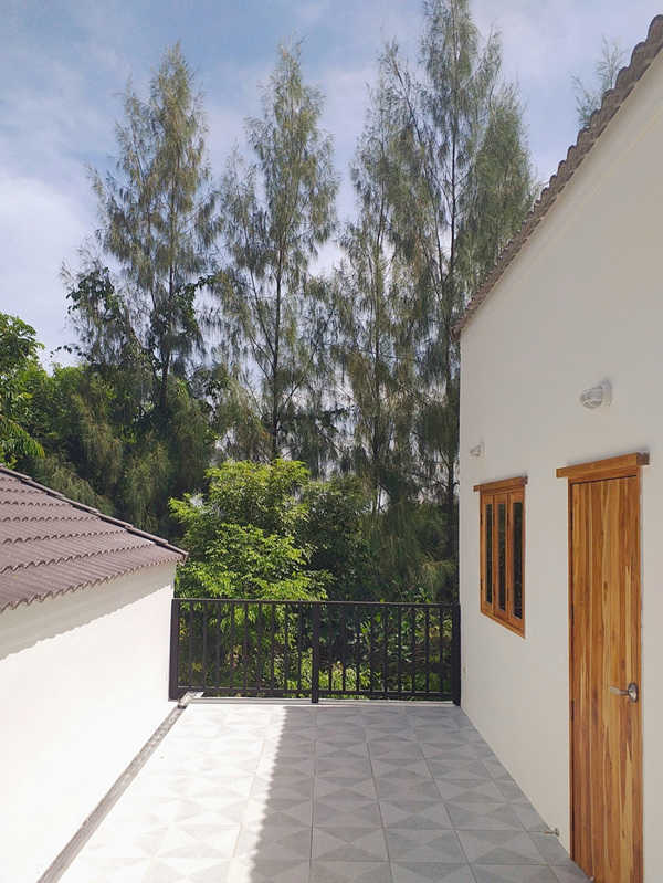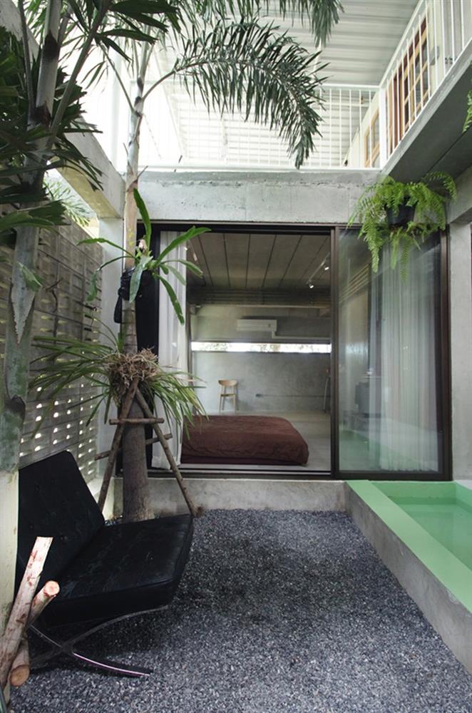 Thiết kế căn nhà nhấn mạnh vào sự thông thoáng và làn gió tự nhiên. Tầng trệt có tường chắn lỗ thông gió và một ban công lớn trên tầng 2, bên cạnh phòng ngủ. Ban công không quá rộng nhưng vẫn được gia chủ sắp đặt hiệu quả, hình thành một vườn cây xanh và bể nước màu ngọc bích độc đáo, đẹp mắt.