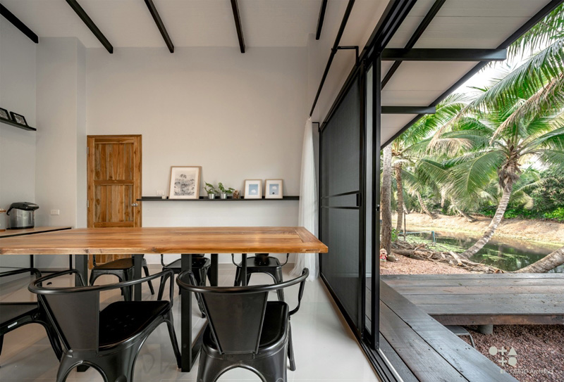 Căn nhà vườn 1 tầng gồm 1 phòng ngủ, 1 phòng tắm nằm yên ả bên con kênh nhỏ và rặng dừa xanh mát. Ngôi nhà màu trắng nổi bật với mái hiên trước nhà và hệ thống cửa trượt độc đáo tạo nên một không gian phòng khách rộng mở, chan hòa với thiên nhiên.