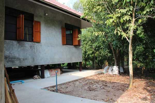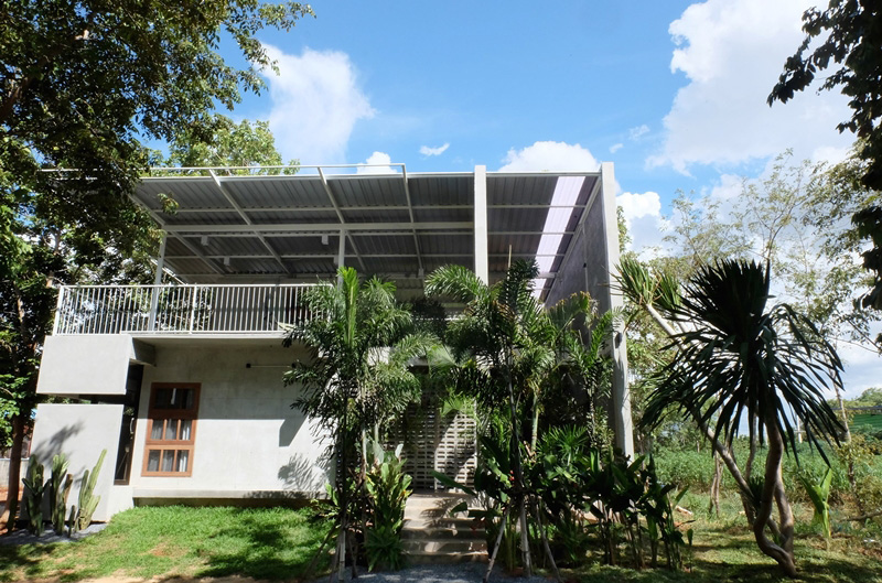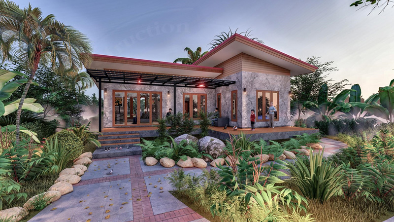 Đây là mẫu nhà vườn hiện đại, vừa đẹp lại thoáng mát được bố trí hình chữ L và nâng lên trên cao nhằm tránh nguy cơ ngập úng.
