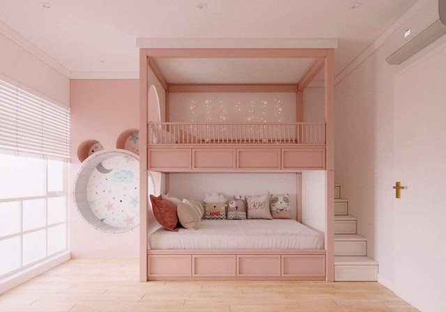Căn phòng mang tông hồng phấn xinh xắn, có đầy đủ tiện nghi gồm giường tầng, tủ quần áo, kệ đồ chơi và cửa sổ lớn đón ánh sáng tự nhiên. Tổng thể căn hộ cũng vô cùng xinh xắn với 2 gam màu hồng và xanh, nội thất cao cấp.