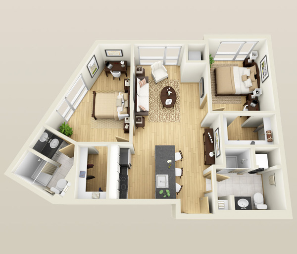 Chiều ngang nhà là hai phòng ngủ đầy đủ tiện nghi với cách phối màu trẻ trung. Phần vát của căn hộ với ưu điểm là mặt thoáng được biến thành phòng khách kiêm bếp - ăn tiện nghi.