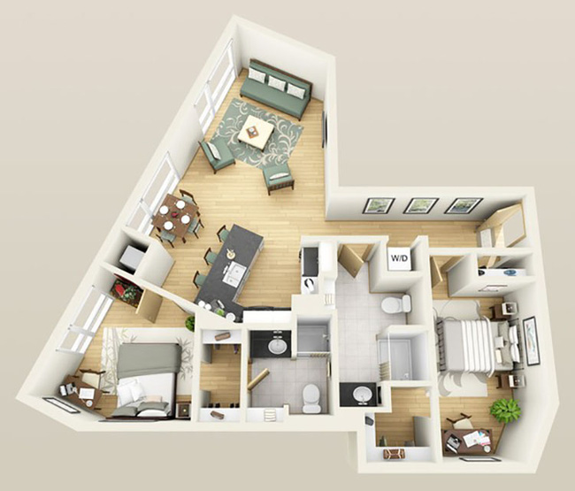 Ai cũng biết là những căn hộ có khuôn nhà vuông vắn sẽ dễ bài trí hơn những căn hộ méo, vát. Tuy nhiên những căn hộ méo lại thường có mặt thoáng rộng rãi hơn, thế nên nếu biết khéo léo tổ chức và bài trí thì kiểu căn hộ nhược điểm này vẫn có thể trở nên đẹp mắt, rộng rãi và tiện nghi.