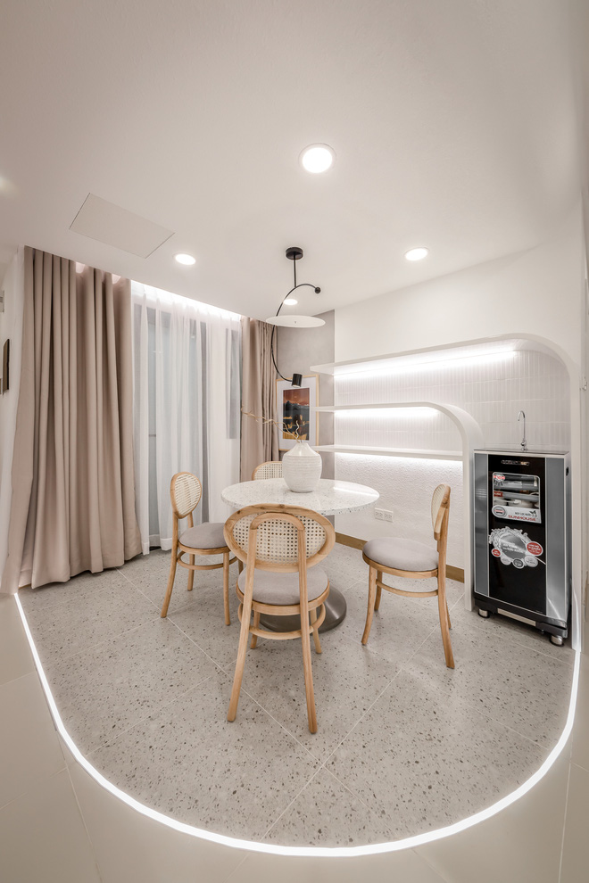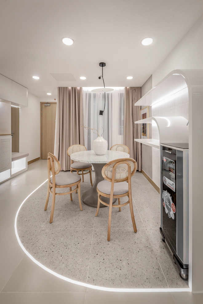 Tuy là không gian mở nhưng khu vực ăn lại được phân chia với bếp và phòng khách bằng việc sử dụng 2 loại gạch khác nhau. Gạch lót sàn khu vực ăn uống là gạch terrazzo cùng họa tiết với đá terrazzo của bàn ăn, vừa đẹp mắt và vừa tạo sự đồng nhất. Ngay tại vị trí chuyển đổi gạch là hệ thống led phát sáng âm sàn rất ấn tượng, mang đến cảm giác mới lạ.