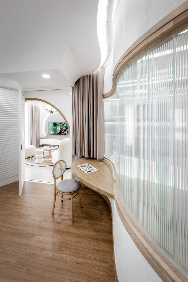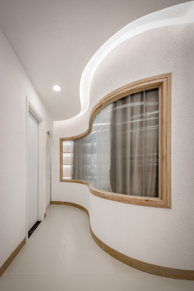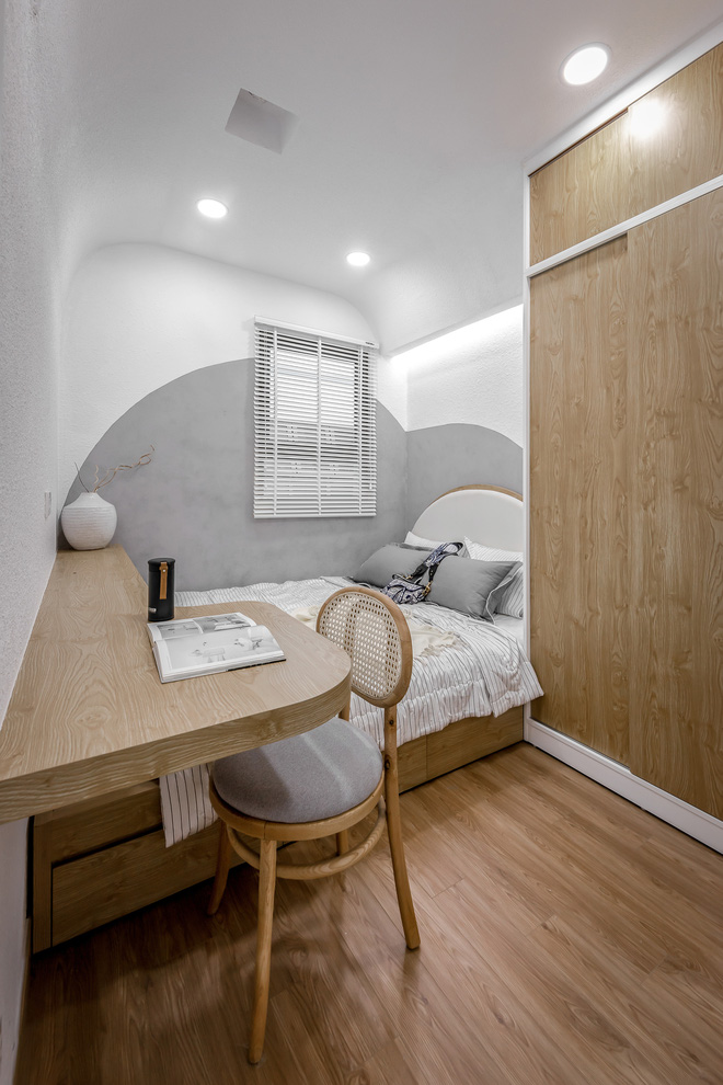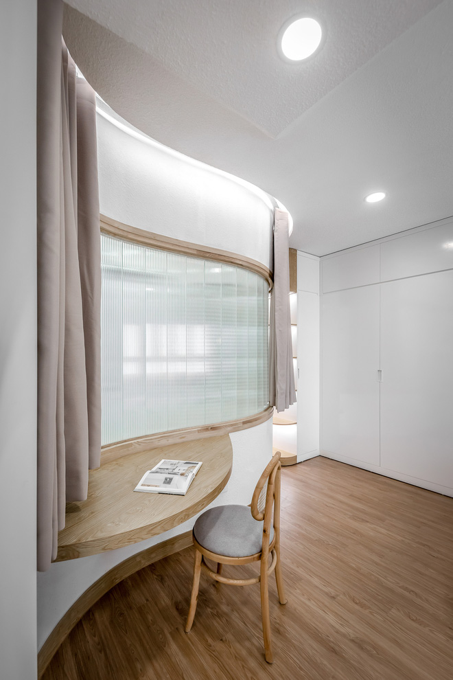 "Gia chủ là người rất có cá tính nên không gian vì thế mà cũng phải có điểm nhấn khác biệt", theo KTS Anh Quý. Để làm được điều này thì phần tường của phòng ngủ chính đã được đập đi và xây lại với đường cong uốn lượn quyến rũ. Bên cạnh đó, cửa phòng được thay đổi thành hệ cửa lùa để tối ưu hóa diện tích.