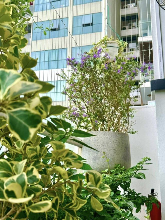 Màu hoa tím phủ ban công nhà Tự Long - Minh Nguyệt. Bà mẹ 3 con tiết lộ: "Xinh xắn, hoa quanh năm 3 màu".
