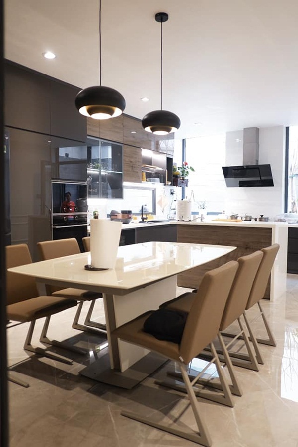 Trong các hình ảnh, ngôi nhà được xây dựng với thiết kế thông thoáng, tông màu chủ đạo là trầm trên nền tường màu trắng. Nội thất trong nhà là nâu, ghi xám, đen tạo nên một không gian sang trọng, đặng cấp như khách sạn 5 sao. Từ phòng khách cho tới phòng ngủ, bếp... đều được trang trí khoa học khiến ai cũng có cảm giác thoáng mát ngay từ cái nhìn đầu tiên. Nhà có cả hồ cá cảnh đẹp mắt và thang máy tiện nghi.