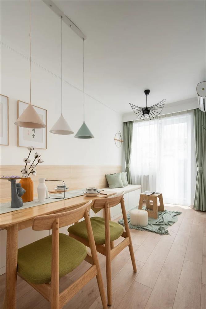 Không gian sinh hoạt chung bao gồm phòng ăn và phòng khách. Thiết kế ghế gắn tường tiết kiệm diện tích được kéo dài từ khu vực phòng ăn sang phòng khách cung cấp cho người dùng nhiều không gian ngồi nghỉ ngơi hơn. Tất nhiên, thiết kế tiện dụng này cũng không quên khai thác bên dưới gầm ghế làm không gian lưu trữ đồ dùng sinh hoạt đầy tiện lợi.