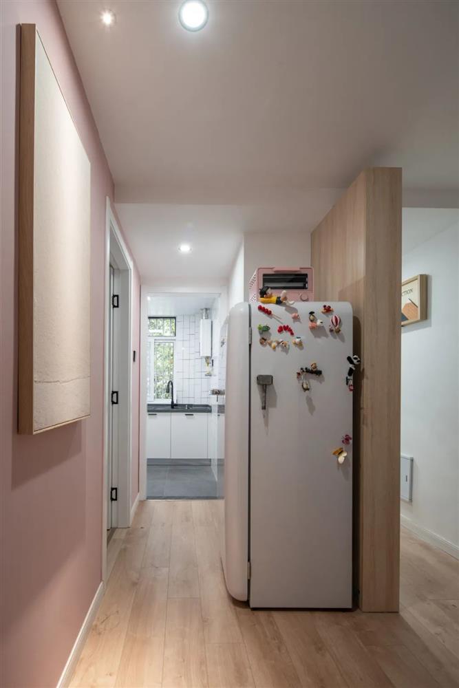 Vì diện tích nhỏ nên tủ lạnh được đặt tại lối vào nhà bếp.