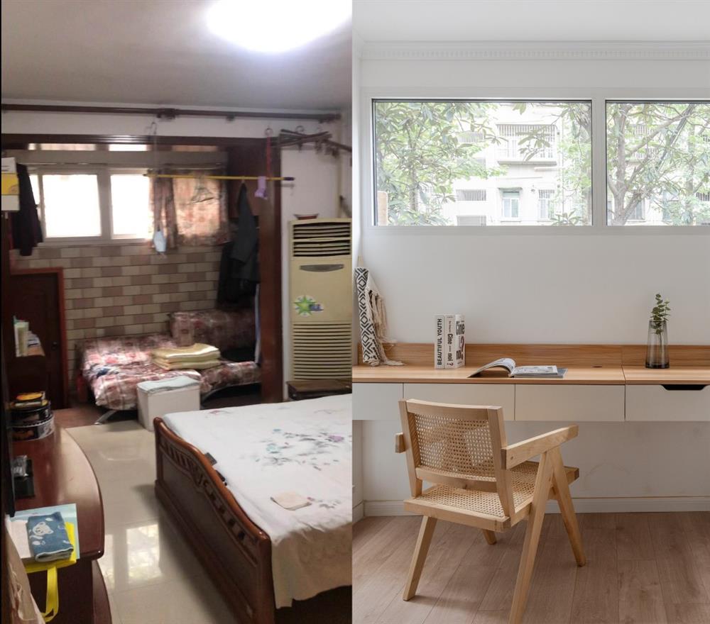 Tất nhiên, không gian phòng ngủ chính cũng được thay đổi với diện mạo hiện đại, khác biệt hoàn toàn trước kia. Gam màu trắng chủ đạo kết hợp với chất liệu gỗ tự nhiên mang đến căn phòng ngủ một không gian bình yên, vô cùng thư thái. Ngoài giường ngủ, tủ quần áo, trong phòng còn có thêm một dãy bàn gắn tường dùng như góc làm việc tại nhà hoặc nơi đọc sách của 2 vợ chồng.