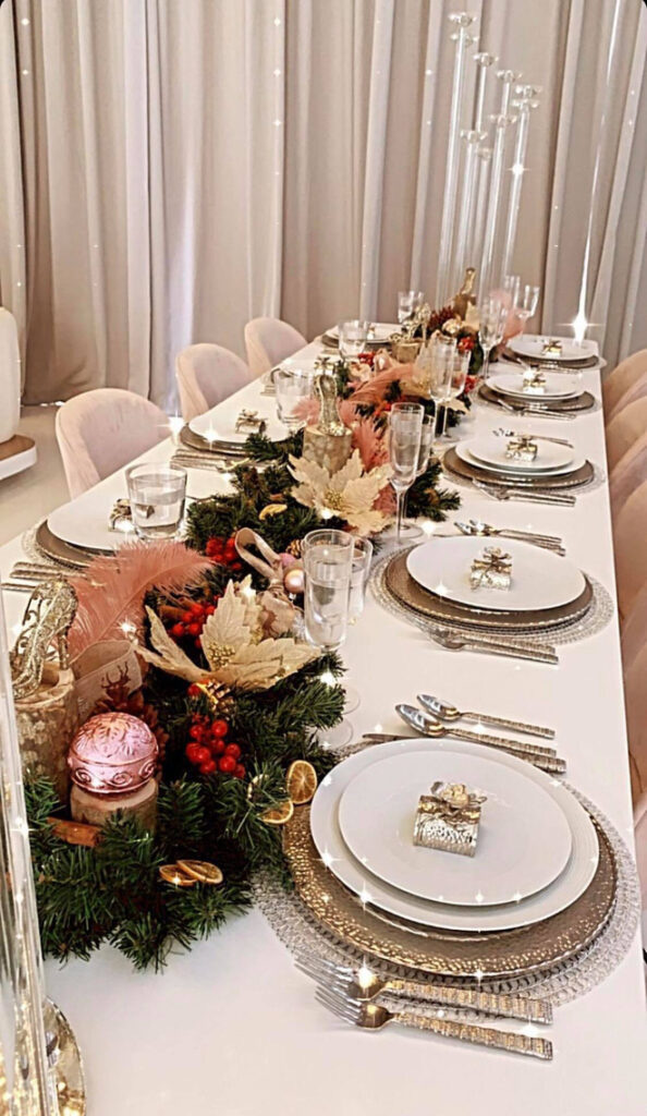 Khu vực bàn ăn được Ngọc Trinh trang trí theo phong cách châu Âu với lá kim, quả thông, bát đũa quý tộc... Còn phòng khách là những chùm đèn trần lộng lẫy.
