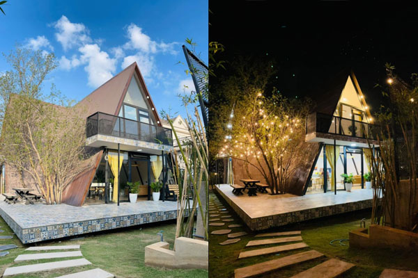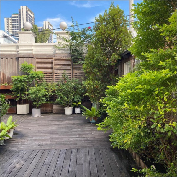 Khoảng sân vườn bên ngoài được lót gỗ - nơi vợ chồng Tăng Thanh Hà có dịp sinh hoạt, trồng cây, nướng thịt cho vào dịp cuối tuần.