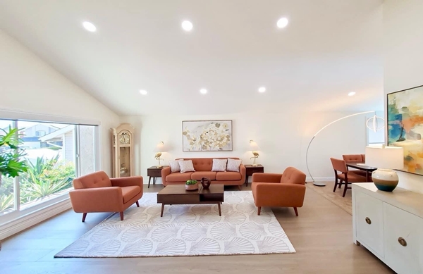 Phòng khách của ngôi nhà sử dụng tông màu cam chủ đạo, cảm giác ấm cúng, thân thiện khi bạn bè, đồng nghiệp đến thăm. Thúy Nga sơn lại tường, bày trí thêm tượng, tranh Phật và đồ đạc phù hợp với sở thích.