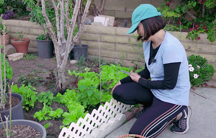 Hồng Đào thích thú với các loại rau Việt được trồng trong vườn đã lên lá xanh tốt.