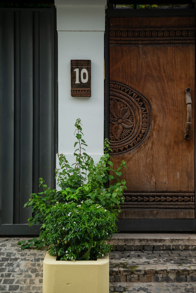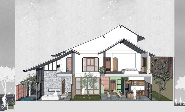 Phần mặt tiền gợi nhớ về kiến trúc nhà truyền thống nhờ những chất liệu và hình ảnh quen thuộc như mái ngói, gỗ tự nhiên, gạch thẻ, họa tiết cách điệu trống đồng...