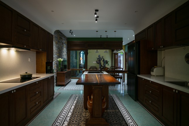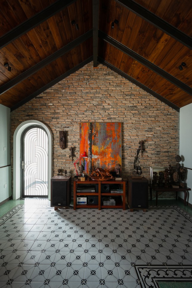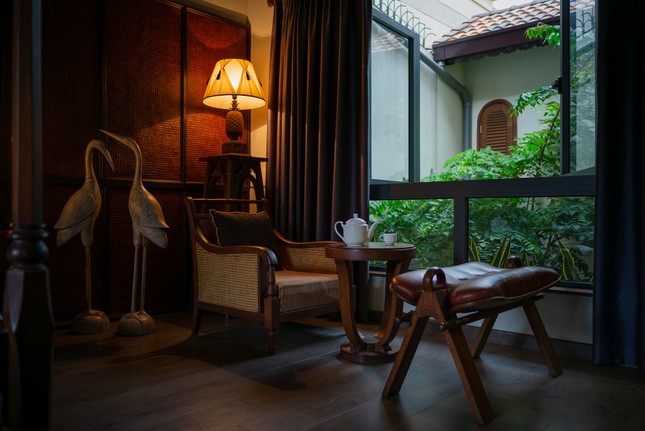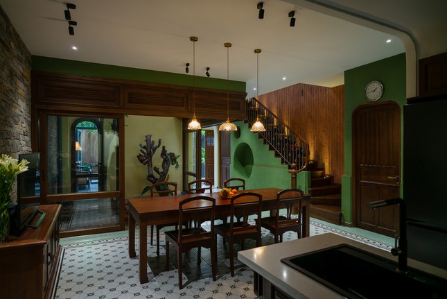 Phòng khách mang đậm hơi thở Đông Dương với nội thất gỗ, tượng điêu khắc, gạch bông lót sàn, con tiện, tranh sơn dầu, đèn chụp kiểu Pháp....