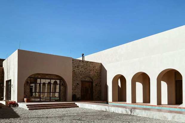 Tòa nhà chính được tạo nên từ những phiến đá dày 600mm. Không gian tạo điểm nhấn bằng hồ bơi phía trước, hành lang được kết nối bởi những khung cửa mái vòm độc đáo.