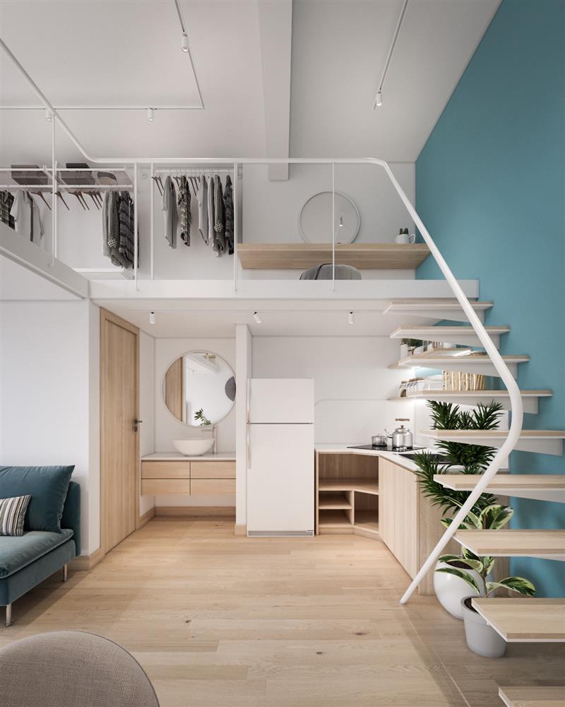 Một cầu thang cách điệu gọn gàng mà đẹp mắt dẫn đến phòng ngủ áp mái đã gây ấn tượng đặc biệt cho căn hộ này. Màu trắng của những bậc thang phóng khoáng không vách ngăn và tay vịn nổi bật trên nền tường màu xanh da trời đã vẽ nên một không gian đầy tính thẩm mỹ, tối giản nhưng lại vô cùng thu hút.