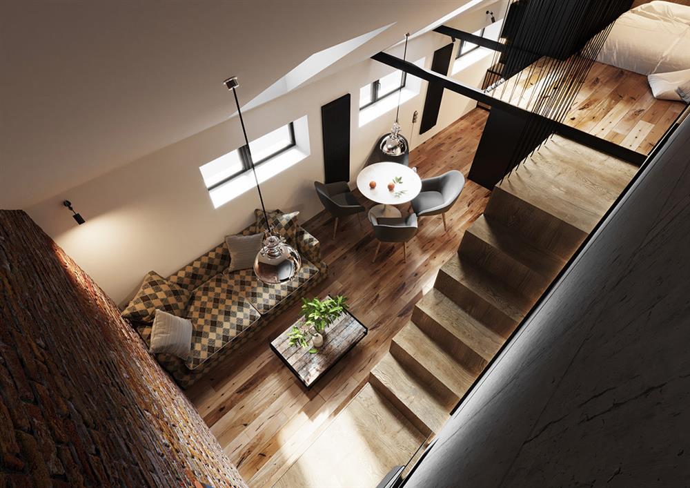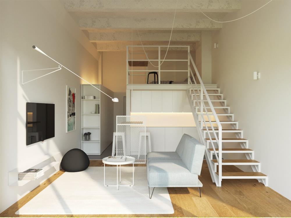 Đây là một căn hộ rộng 36m² với chiếc đèn tường cán dài thanh mảnh nổi bật trong phòng khách nhỏ. Một cầu thang sơn tĩnh điện màu trắng tạo nên một thiết kế phòng ngủ đơn giản, nằm dưới lớp bê tông công nghiệp.