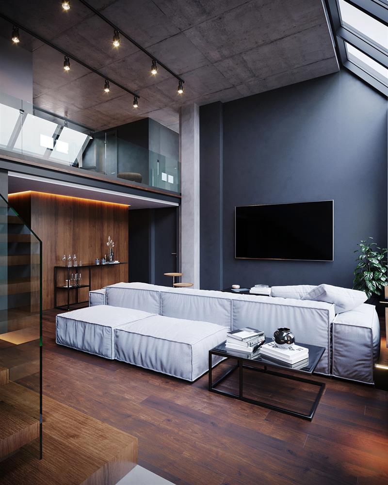 Chuyến tham quan thứ 5 lại mang đến một ấn tượng hoàn toàn sang trọng pha lẫn phong cách tối giản hiện đại. Ghế sofa bản rộng bọc đệm màu xám nhạt tương phản hài hòa với sàn gỗ màu nâu ấm. Một chiếc đèn chùm hiện đại bổ sung thêm yếu tố điêu khắc cho trần bê tông phong cách công nghiệp.