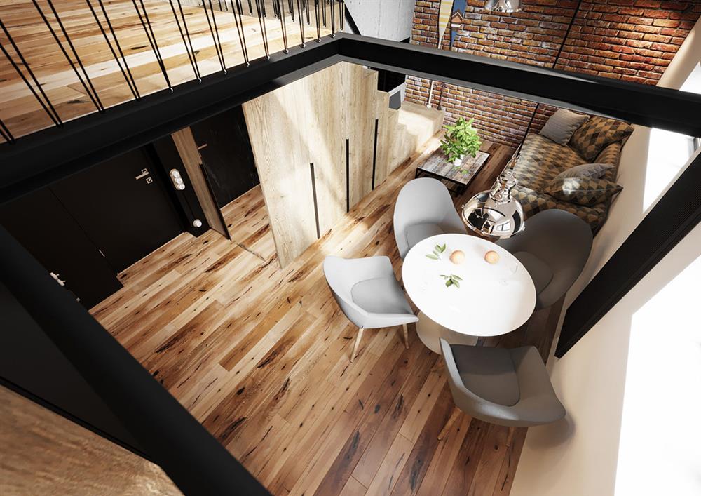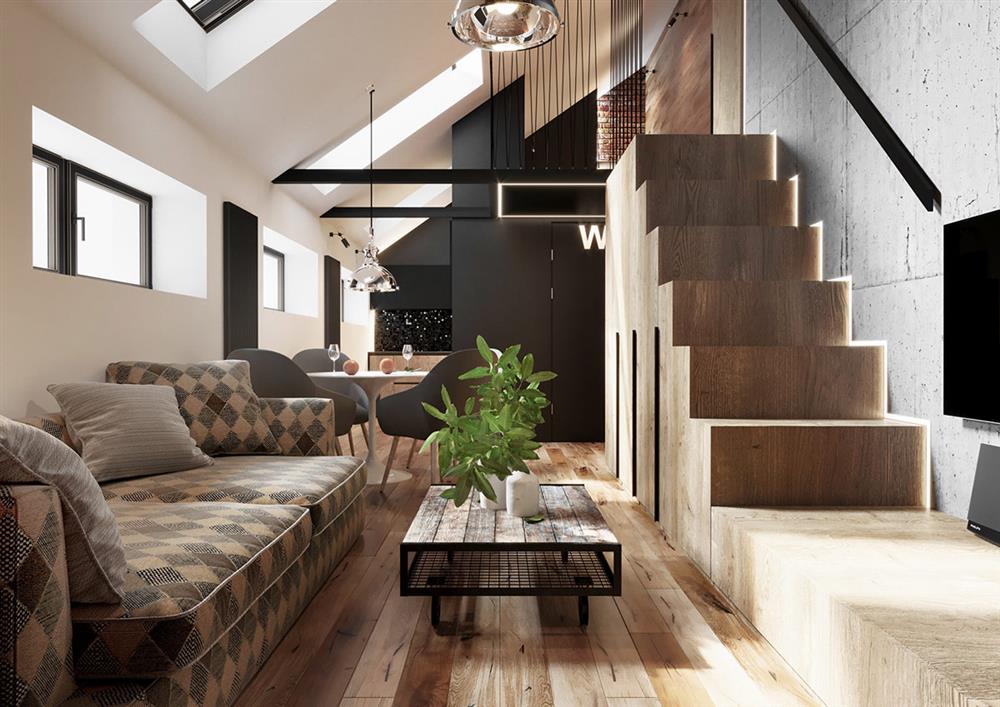 Thiết kế cuối cùng là nội thất gia đình với cảm giác mộc mạc thoải mái, được gợi lên bởi các yếu tố gỗ thô và gạch lộ ra ngoài.