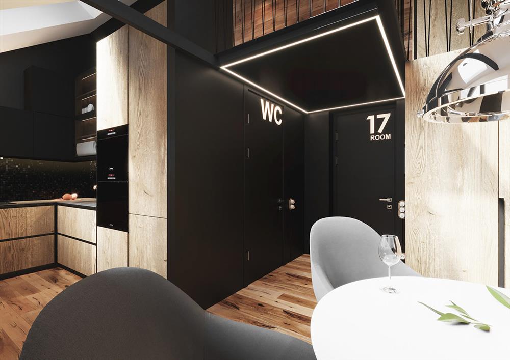 Tủ đựng đồ lớn ẩn sau cánh cửa trước bằng phiến trắng bí mật. Tính thẩm mỹ kín đáo này cũng được điều chỉnh cho cửa phòng tắm. Bên cạnh đó, một bức tường đặc trưng màu đen được sử dụng để đánh lạc hướng thị giác và tạo cảm giác căn phòng có chiều sâu hơn.