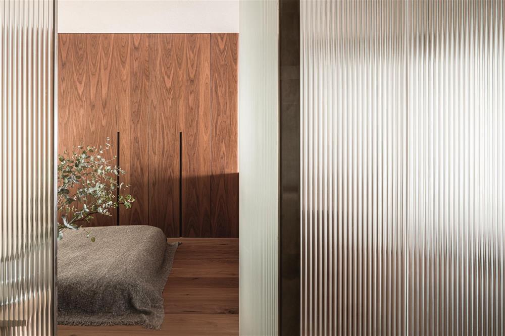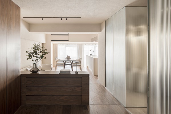 Một phòng tắm có vách ngăn đặt cạnh lối vào cho phép ánh sáng tự nhiên có thể tràn vào khắp căn phòng. Những gì từng là một căn hộ 4 phòng nhỏ gọn giờ đây trở thành không gian sinh hoạt có bếp và phòng ngủ rộng rãi theo lối thiết kế mở, được ngăn bằng đồ nội thất tối giản và các phụ kiện. Những bức tường trắng có họa tiết được thay thế bằng bức tường màu be, kết hợp cùng đồ nội thất bằng gỗ óc chó sẫm màu có thiết kế đơn giản nhưng vẫn toát lên nét hiện đại.