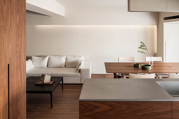 Điều cốt yếu của phong cách thiết kế tối giản kiểu Nhật chính là sự tinh giản trong trang trí nhằm giúp không gian thông thoáng hơn. Vì thế các khu vực bên trong nhà được thông nhau, giúp căn phòng như được mở rộng ra về mặt thị giác. Tường nhà màu be sáng kết hợp với những món đồ nội thất sẫm màu thể hiện sự tương phản về màu sắc đồng thời làm nổi bật cho không gian