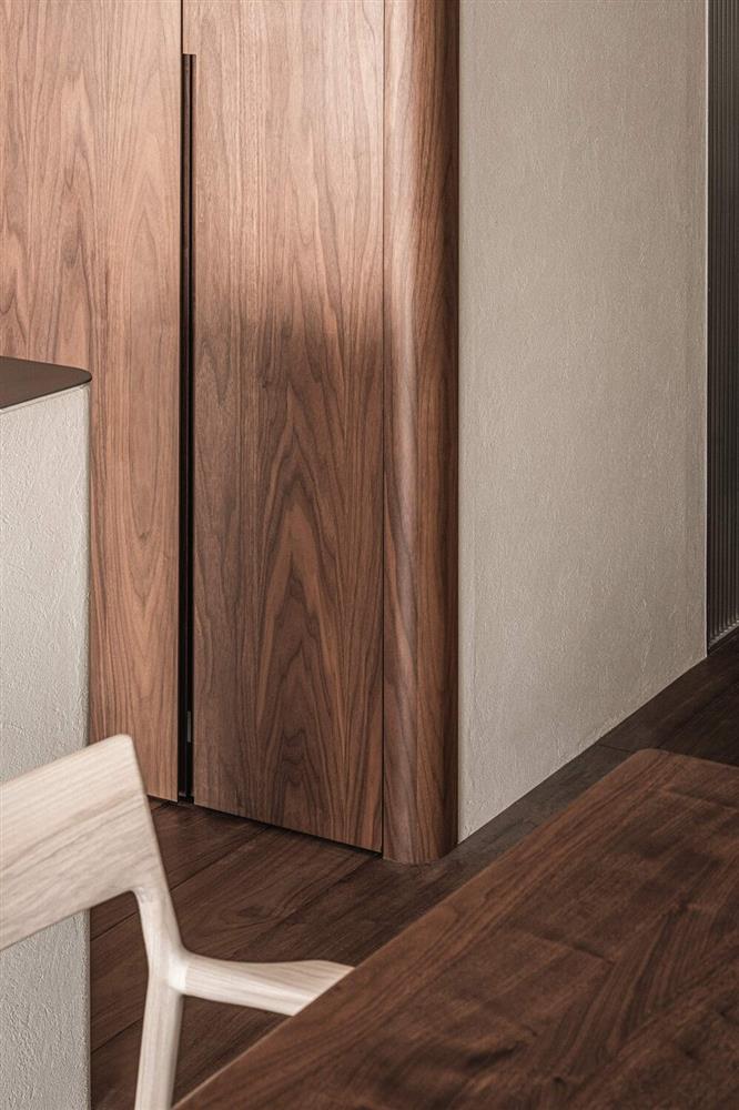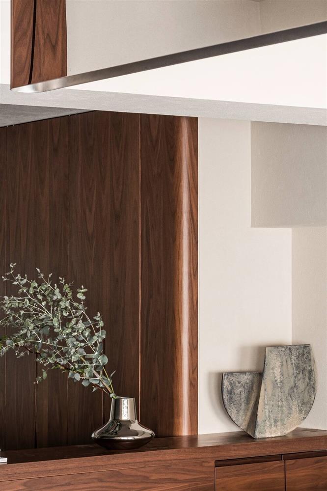 Tất cả các góc tường, phụ kiện và đồ nội thất được thiết kế thành các cạnh tròn mềm mại, ưu tiên làm nổi bật chất lượng và kết cấu của vật liệu. Ánh sáng trong phòng chủ yếu là gián tiếp, như các dải đèn LED âm tường ở các góc, hoặc ẩn trong các giá treo tùy chỉnh trên trần nhà.