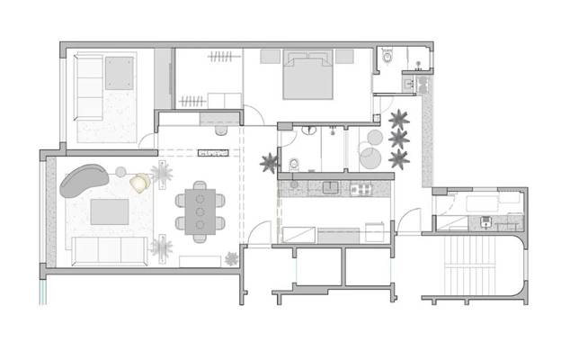 Đây là căn hộ có diện tích 138m², được xây dựng từ rất lâu. Vấn đề lớn nhất mà không gian ban đầu gặp phải là có quá nhiều tường ngăn, lối đi phân chia các khu vực chức năng cũng nhiều theo dẫn đến hiệu suất sử dụng không gian bị giảm và ánh sáng yếu. Trong lần cải tạo mới, những bức tường ngăn không cần thiết được loại bỏ, tạo nên sự cân bằng thú vị giữa sự mộc mạc và tinh tế, đơn giản nhưng vẫn đầy sức sống.