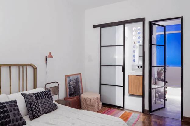 ▲ Tường trắng và kính khung đen của phòng ngủ chính khá mới mẻ, những tấm thảm màu sắc, tranh trang trí và ghế đẩu cho thấy bầu không khí thoải mái của cuộc sống gia đình.