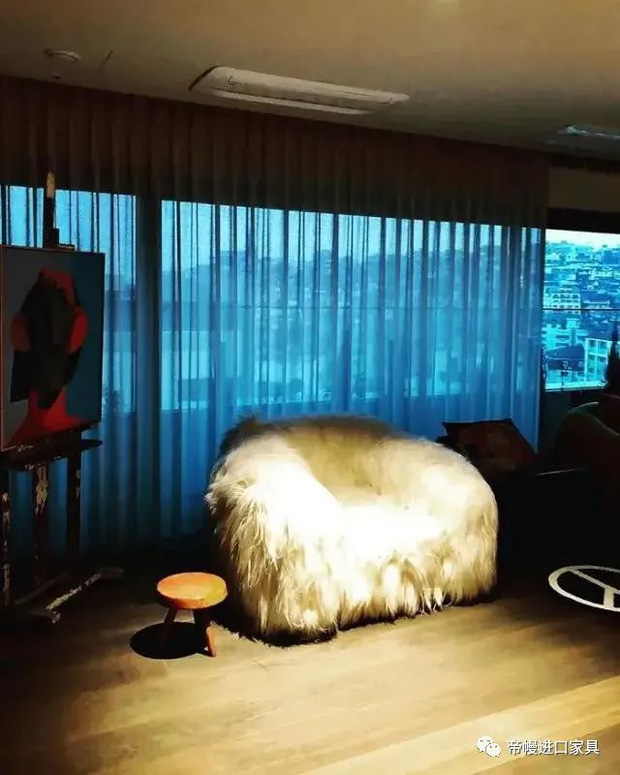 Chiếc ghế sofa đơn bằng lông do chính nhà thiết kế nội thất nổi tiếng của nước Pháp Jean Royère làm nên cực kì khó mua. Bên cạnh sofa là chiếc ghế đẩu nhìn không quá bắt mắt nhưng khi biết được lai lịch của nó bạn sẽ phải giật mình. Chiếc ghế này ra đời vào năm 1950, trải qua bao năm tháng khiến vân gỗ của nó càng hiện rõ, giá trị càng tăng cao. Hiện tại, nó có giá khoảng 160.000 NDT (tương đương với 560 triệu VND).