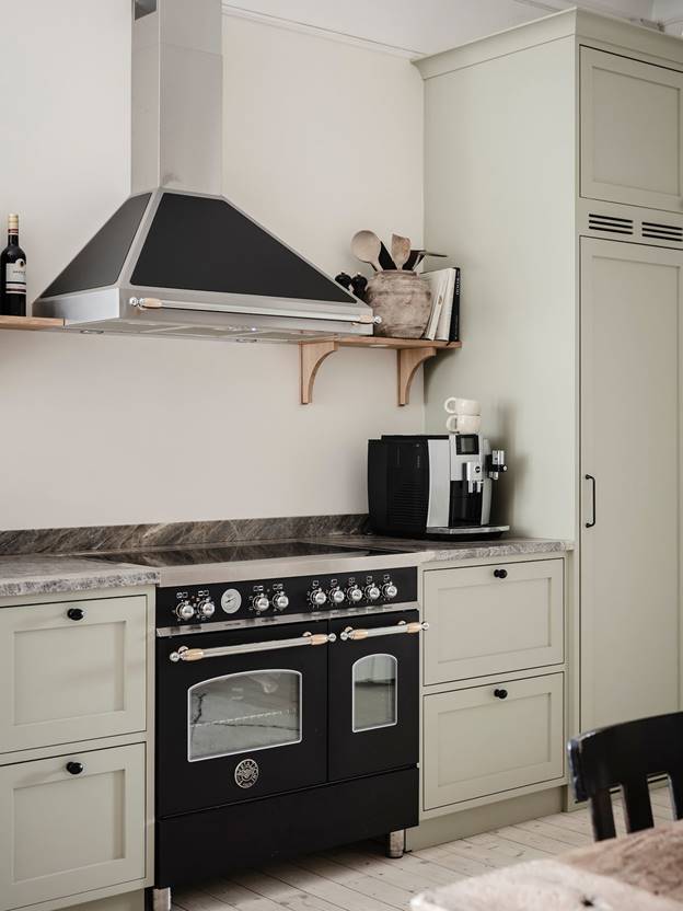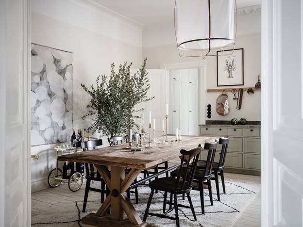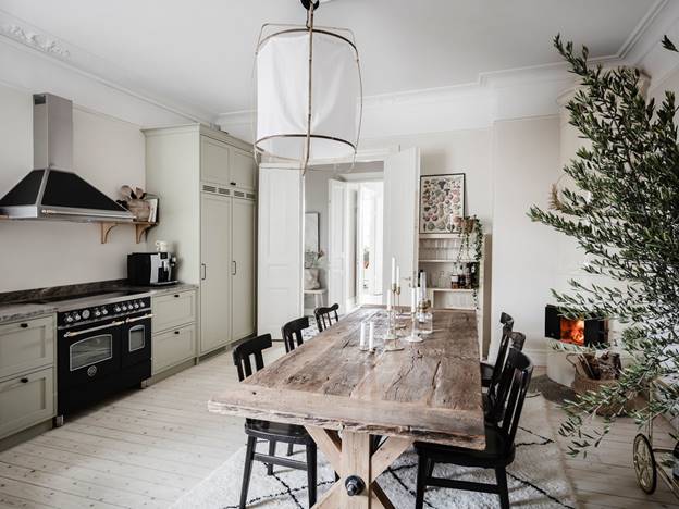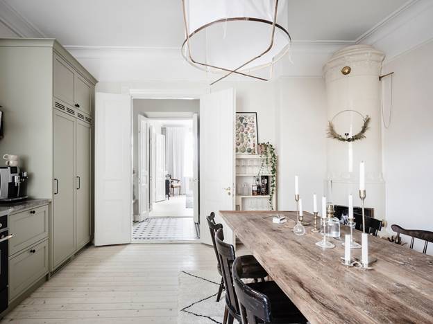 Một trong những không gian ấn tượng nhất và cũng nhiều yếu tố quá khứ nhất trong căn hộ này là nhà bếp gia đình màu xanh lá cây nhạt. Sàn gỗ đã được khôi phục và làm nổi bật bởi lớp sơn mới. Bàn ăn gần như được giữ nguyên bản nhưng nhờ thảm trải sàn, hệ thống đèn nến, bếp nấu, trần thạch cao, màu sơn tường… được kết hợp hài hòa tạo nên vẻ đẹp quyến rũ vượt thời gian cho căn bếp.