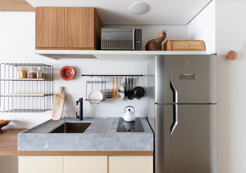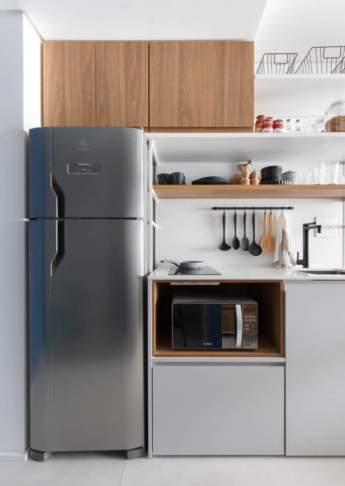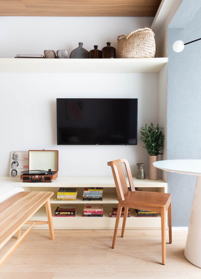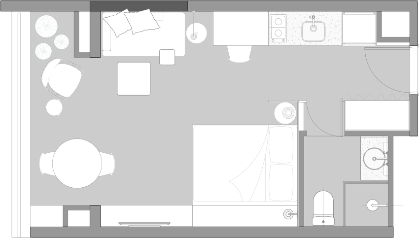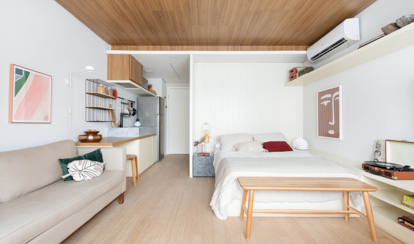 Với không gian nhỏ hẹp và dài, nhóm thiết kế đã nhất trí mở rộng quy hoạch tường và cố gắng không che khuất đường ánh sáng nhiều nhất có thể. Nhà bếp nhỏ và phòng tắm được đặt đối diện nhau, sử dụng các tấm trang trí hình sóng mỏng màu trắng tinh khiết làm cửa ẩn cho tủ quần áo và nhà vệ sinh kéo dài đến bức tường phía sau đầu giường. Điều này để giảm các đường nét phức tạp và giúp cho tầm nhìn không bị cản trở.