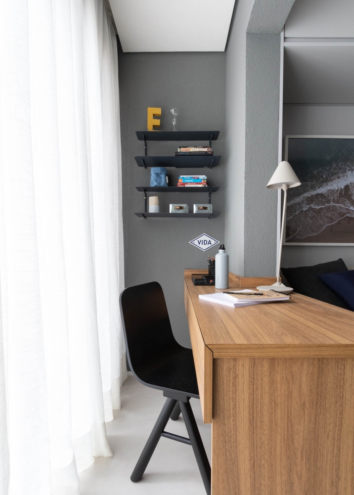 Ngoài ra, căn phòng sử dụng không gian phân mảnh rất thông minh để mở rộng, bàn làm được đặt ở vị trí tràn ngập ánh sáng ban ngày. Trong khoảng không gian rộng lớn màu trắng, góc tường cạnh bàn làm việc được nhuộm một chút màu xanh xám yên bình cùng với màu xanh lá cây tiêu điểm, làm cho cả căn phòng trở nên nhẹ nhàng và yên tĩnh hơn.