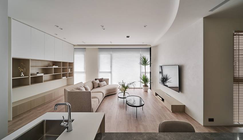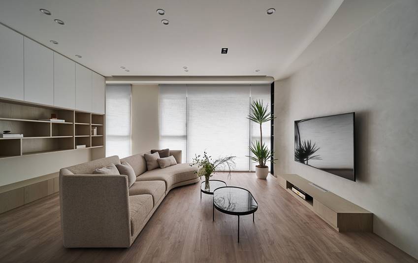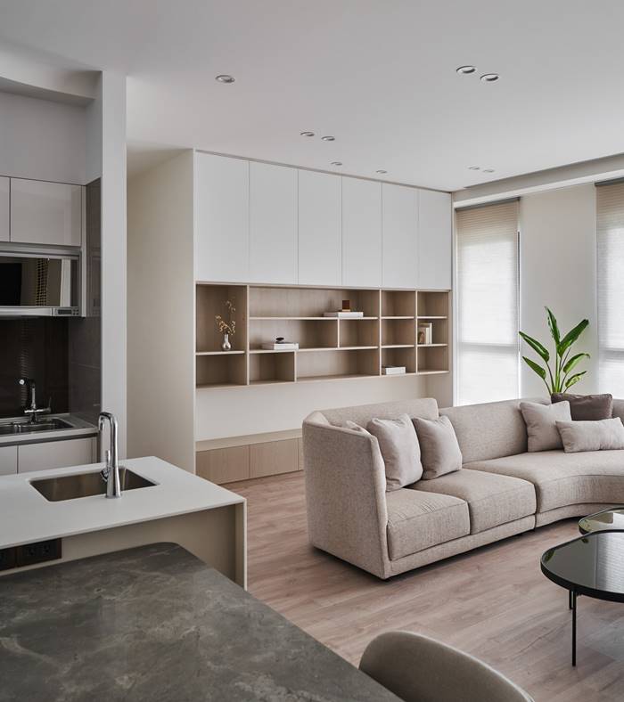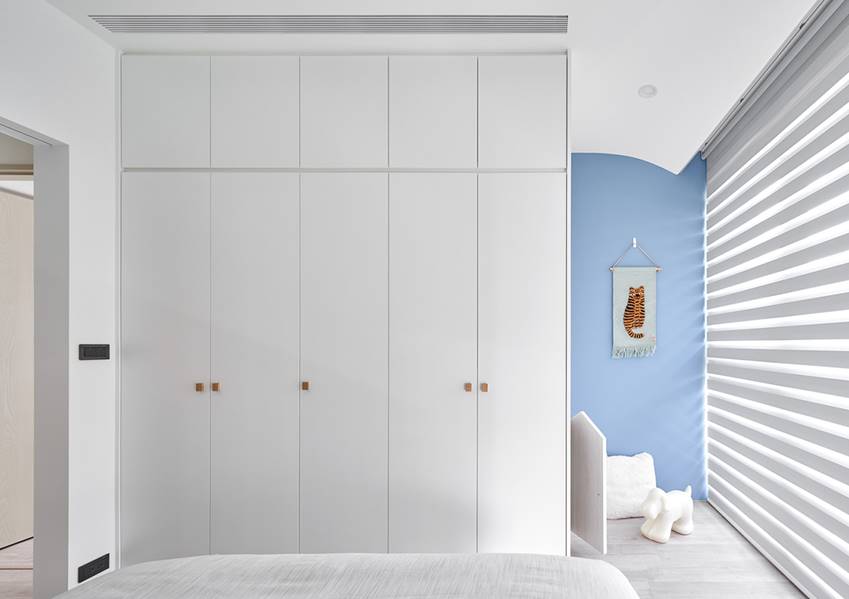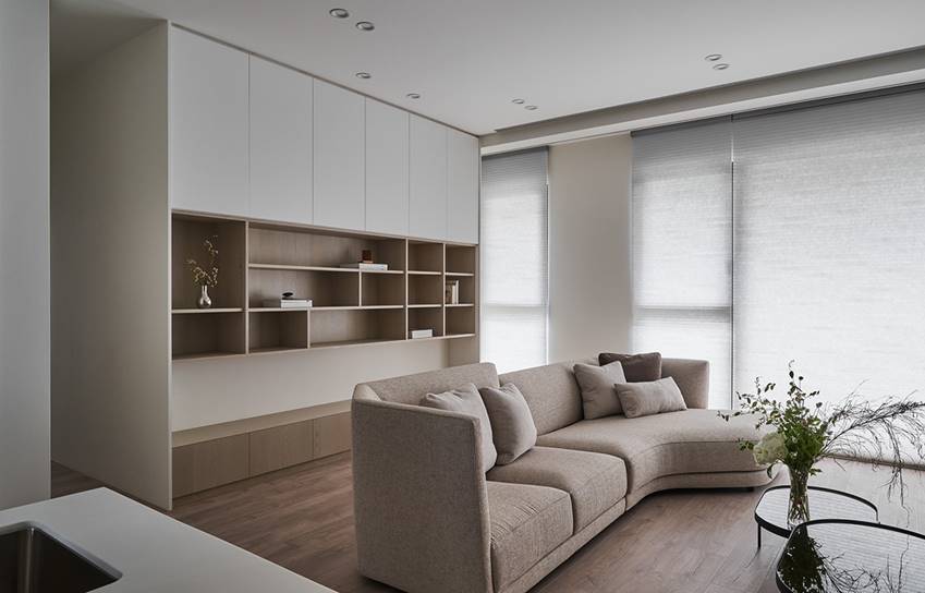 Căn hộ được xác định là nơi cư trú cho kỳ nghỉ ngắn hạn, nên sau khi tính toán toàn diện kích thước và số lượng đồ vật, gia chủ đã sử dụng tủ âm tường cong để quản lý tập trung, gọn gàng các thiết bị gia dụng lớn, dụng cụ thể thao… Thân tủ cố định che khuất bề mặt ánh sáng ban ngày, cho phép ánh sáng mặt trời chiếu khắp phòng.