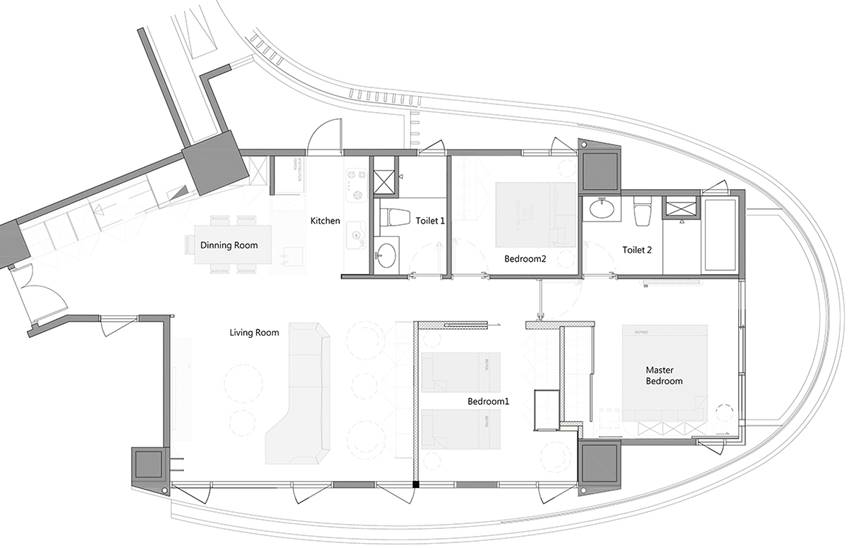 Bắt nguồn từ hình dáng tòa nhà có bề mặt vòng cung, KTS đã đề xuất chọn nét cong tròn là trục thiết kế chính cho căn hộ để tạo hiệu ứng nhất quán, mượt mà trong tổng thể nội - ngoại thất. Chẳng hạn, hành lang lối vào được sửa lại bằng một hình vòng cung cong, và trần khu vực công cộng được bổ sung thêm một đường parabol mềm, trơn tru…. Nhờ đó, cảm giác hỗn loạn, bí bức được loại bỏ và mở ra một không gian yên tĩnh, thư thái quý giá.