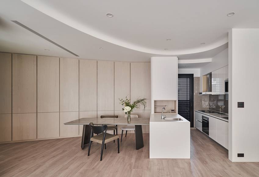 Phòng ăn và nhà bếp được kết nối thông suốt, chúng trở thành khung cảnh ấm áp và đầy ắp tiếng cười trong gia đình. Chủ đề vòng cung tiếp tục được đưa vào theo cấu trúc đường viền bao bọc xung quanh các dầm kết cấu để hướng dẫn thị giác.