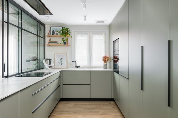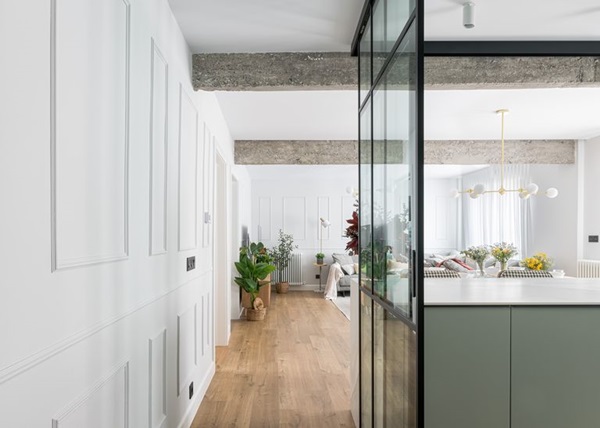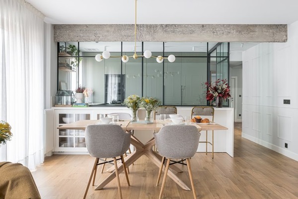 Điểm đặc biệt của căn hộ đó là sử dụng một số vách kính trong suốt ngăn cách giữa bếp và phòng khách. Điều này không chỉ tạo cho căn nhà sự trang nhã và còn rất thông thoáng như bên ngoài thiên nhiên.