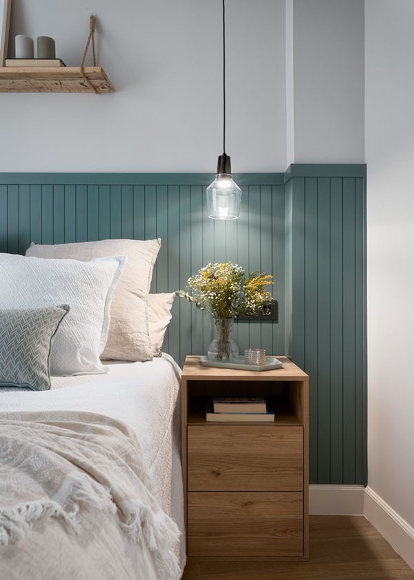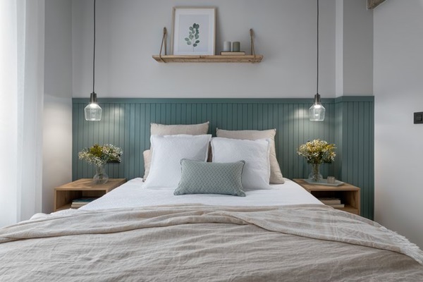 Với phòng ngủ, gia chủ lại điểm xuyết màu xanh nhẹ nhàng trên phía đầu giường. Với ý đồ khiến cho bản thân thư giãn, ngủ ngon hơn mỗi khi đi vào giấc ngủ.