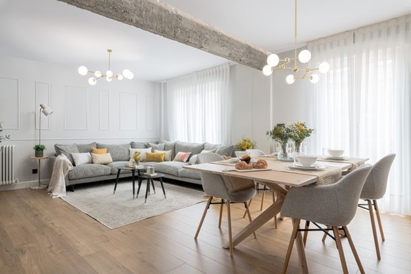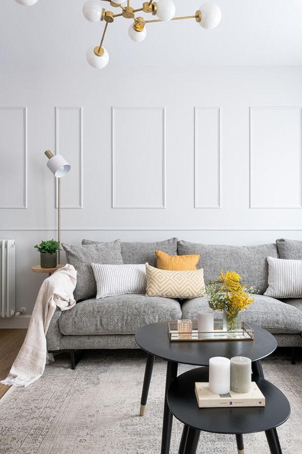 Tổng thể màu sắc căn hộ chủ yếu là trắng kết hợp với xám, sàn nhà màu gỗ. Sự kết hợp này tạo nên vẻ đẹp kinh điển về sự thanh lịch và không bao giờ bị lỗi mốt. Các vật dụng trang trí trong nhà đều vừa phải, phù hợp với không gian, không quá to và nặng nề. Điều này cũng dễ dàng vệ sinh và di chuyển hơn.