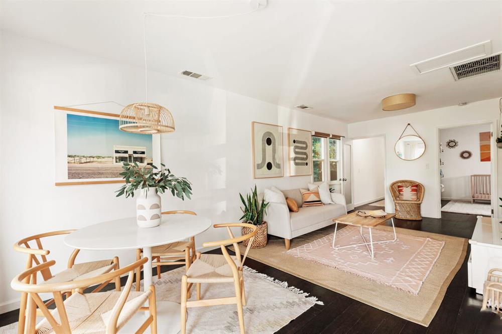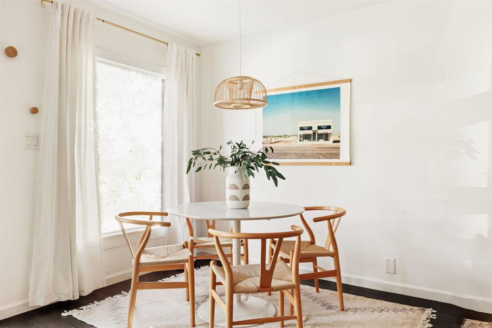 Nằm ngay bên trái cửa là không gian phòng ăn. Bộ bàn ăn tròn thiết kế đơn giản nằm nổi bật trên tấm thảm trải sàn dệt thủ công.